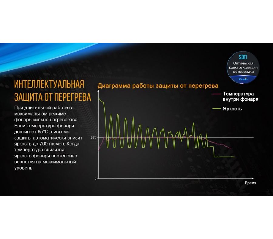 У ліхтарі встановлена система захисту від перегрівання, яка автоматично зменшить яскравість, якщо Fenix SD11 нагріється до 65° або більше.