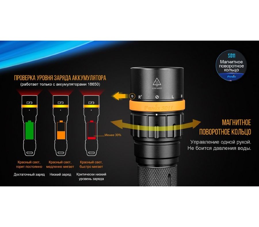 Інструкції по використанню: Ліхтар Fenix SD11 працює на одному акумуляторі 18650. Серед можливий варіантів-батарейки CR123A. управління відбувається за рахунок поворотів магнітного кільця. Зліва направо слідують функції індикації заряду, режимів R+, Off, Low, High.