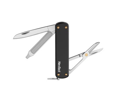 Мультитул оснащений складаними інструментами, що виконують 5 функцій: клинок з нержавіючої сталі 420J2 з прямим заточуванням, ножиці, напилок з плоскою викруткою на кінці, а також отвір для металевого кільця, щоб кріпити конструкцію на ключі, сумці або лямці рюкзака.