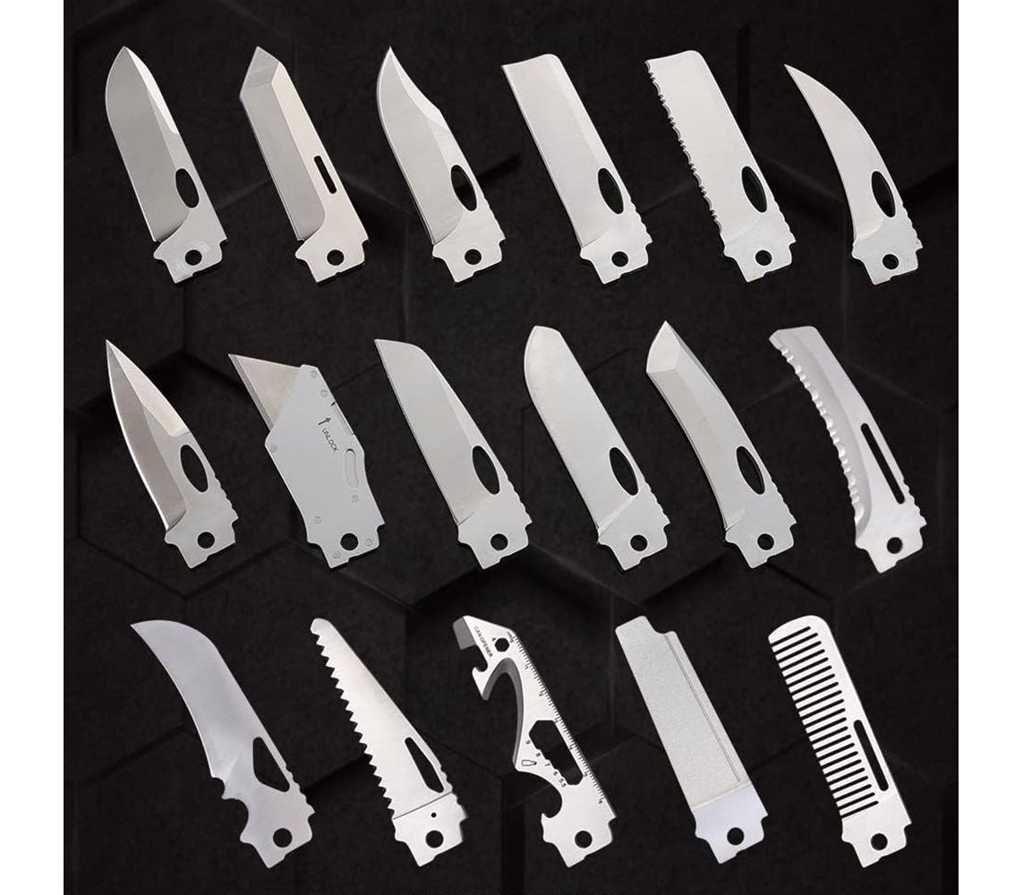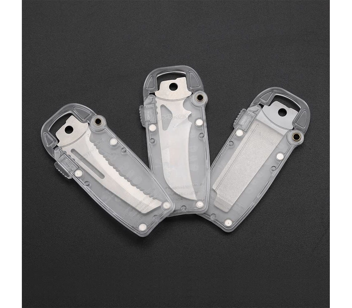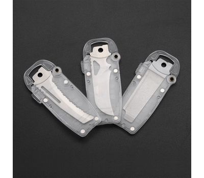 Крім змінних клинків, до набору входять фірмові чохли, розроблені ексклюзивно для цих аксесуарів. Чохли виготовлені з прозорого, зносостійкого матеріалу, що уберігає леза від негативного впливу вологи та робить їх носіння безпечним. У верхній частині кожного чохла є наскрізний отвір та імпровізована петля для кріплення на шльовці штанів.