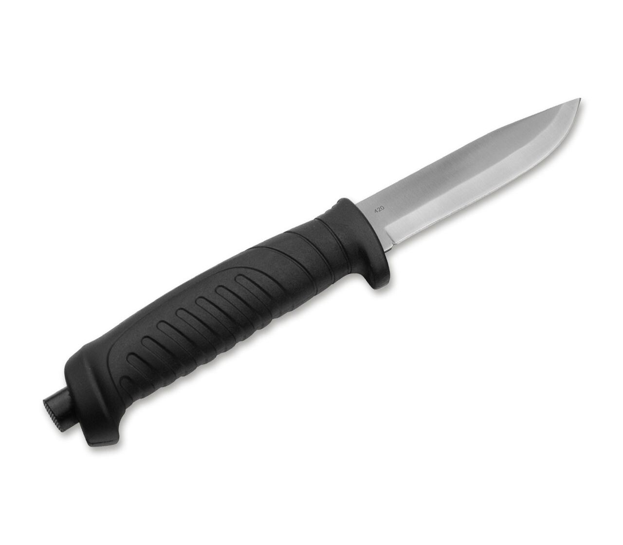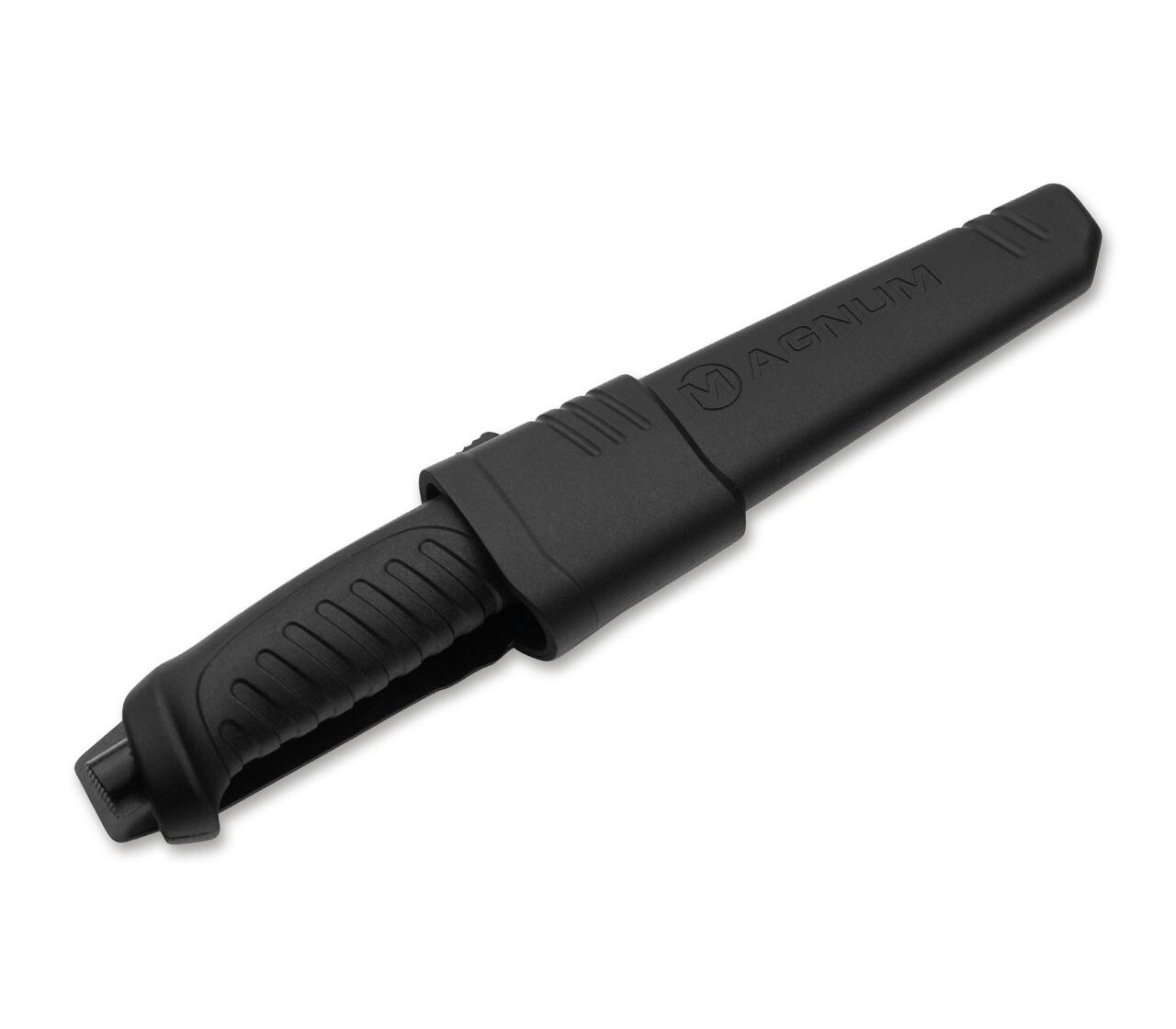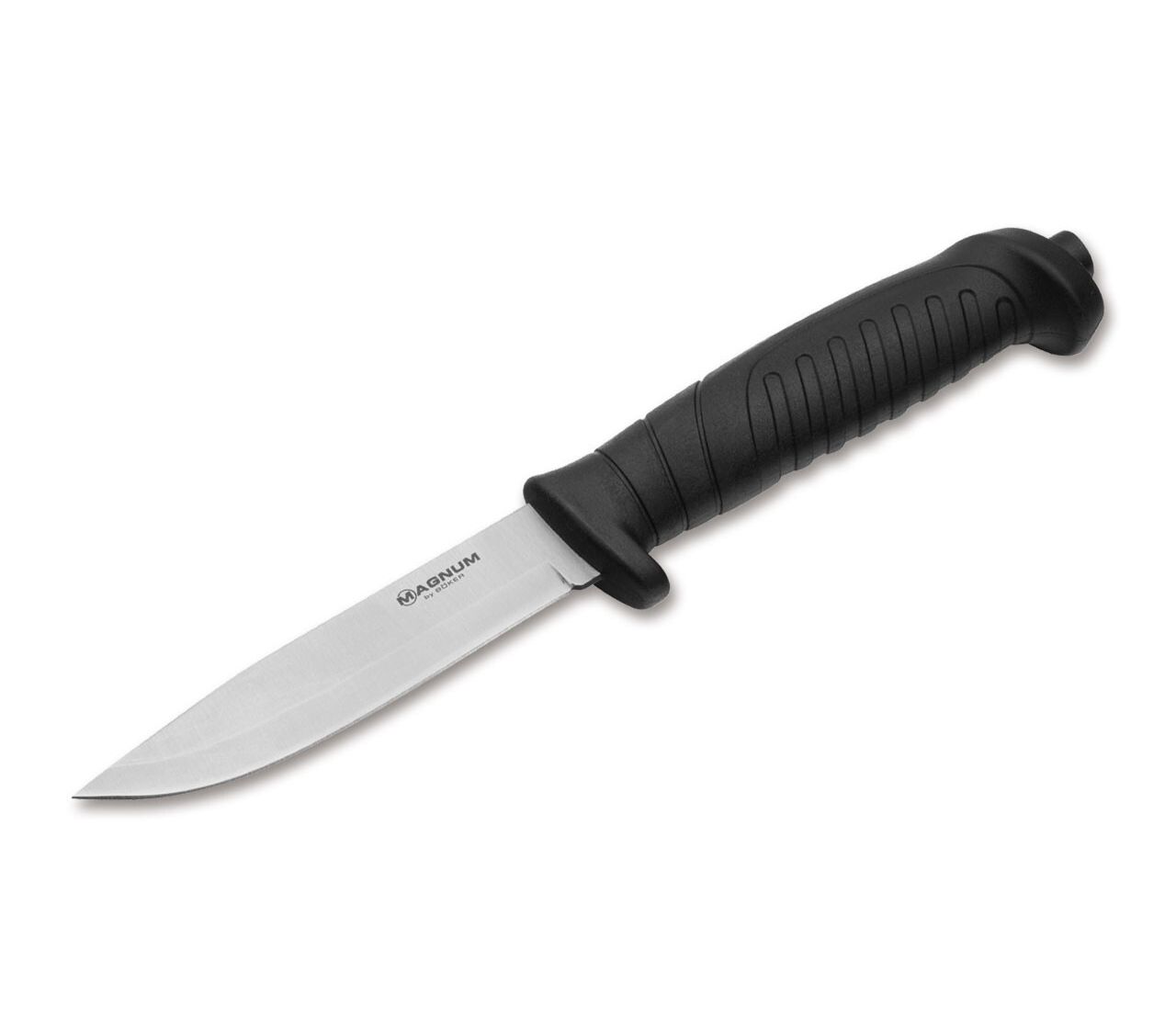 Magnum Knivgar - це безкомпромісне і сучасне втілення ножів скандінавських саамів, випробуваних протягом тисячоліть в суворій північній дикій природі. Це універсальна робоча конячка для жорсткого і безжалісного використання в тренуваннях з виживання, полювання, риболовлю, ремеслах або будь-яких інших мислимих застосуваннях. Лезо виготовлено з нержавіючої сталі 420A, стійке до зламу і легко заточується навіть в польових умовах за допомогою простих засобів. Цілісні піхви з атмосферостійкого пластика мають петлю для ременя. Це дозволяє легко і ретельно очистити всі частини ножа, особливо після полювання.