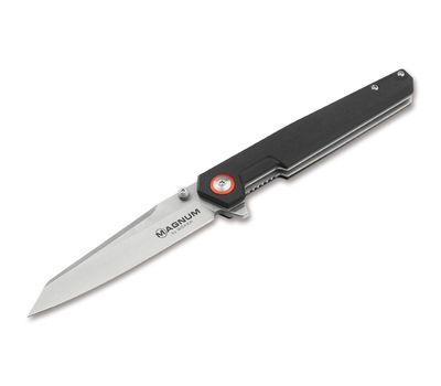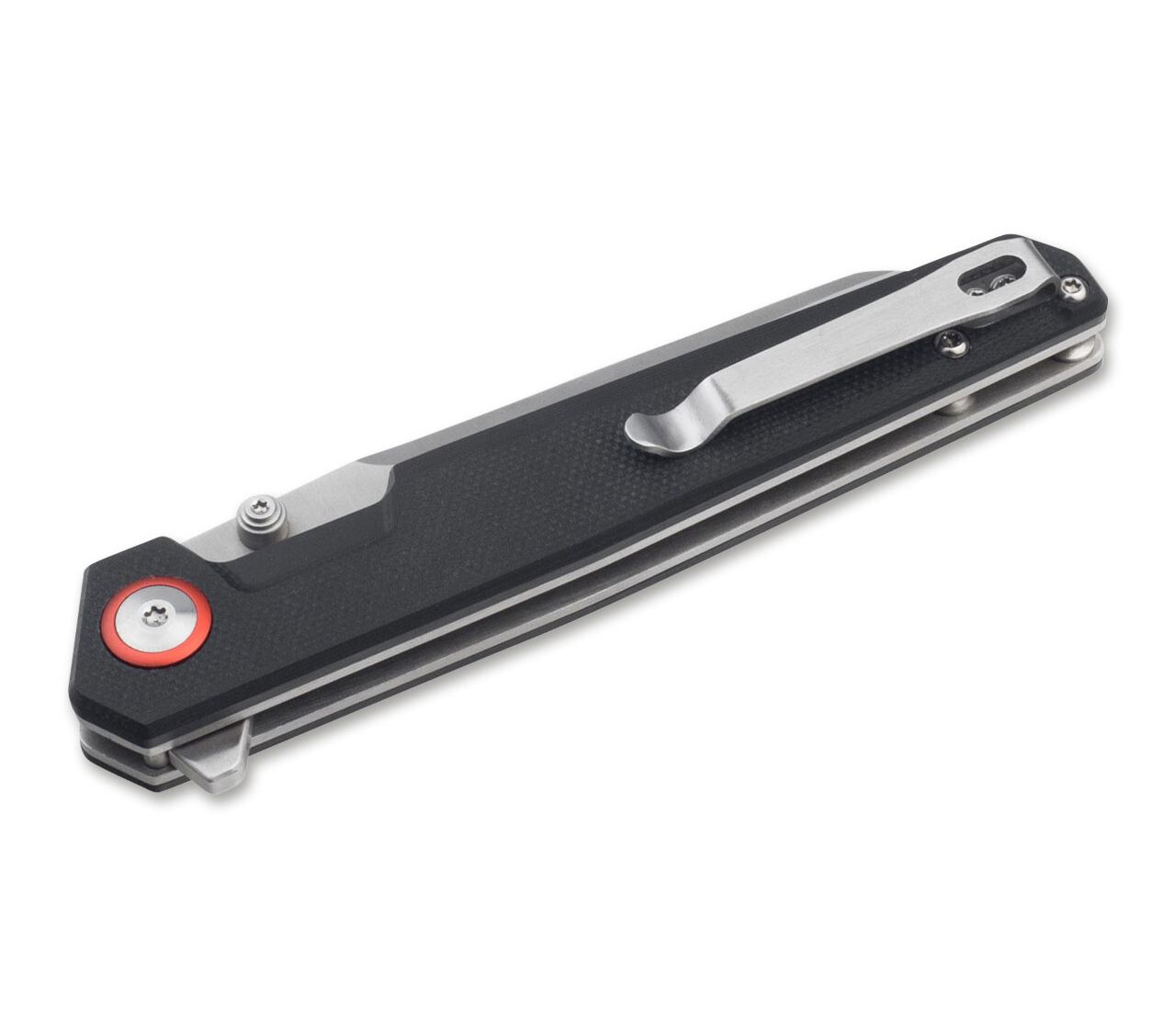 Незвичайний клинок типу Wharncliff відкривається або пальцем, або фліпером і фіксується міцним замком. Оптичним центром кишенькового ножа є червона анодирувана шайба під гвинтом осі леза, яка різко контрастує з чорними лусочками на рукоятці з текстурованого матеріалу G10. З практичним глибоким затискачем для перенесення.