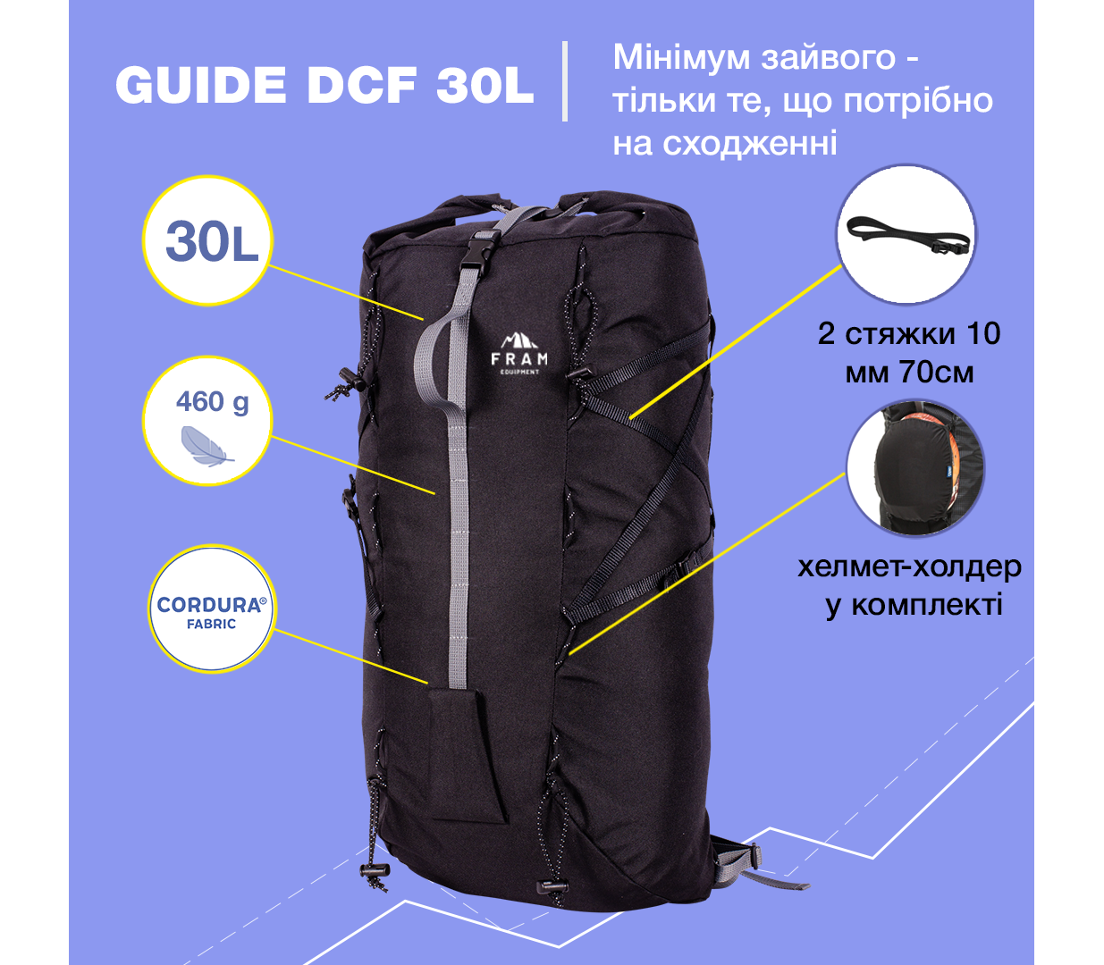 Рюкзак для одноденних сходжень, мінімум зайвого - тільки те що потрібне на сходженні. При мінімалістичному дизайні і вазі наплічник зберіг необхідний для сходжень фукціонал і зносостійкість. Міцна тканина Cordura 500, крій з цільного відрізу тканини, закриття рюкзака на Roll top. Лямки зручні для лазіння та технічної роботи, багато можливостей для кріплення спорядження на рюкзак при підходах, необхідні аксесуари в комплекті. Об’єм ідеальний для одноденного сходження - мотузка, система, перекус і тепла річ до маршруту. Дві пари взуття, аптека, куртка, термос - на маршруті.