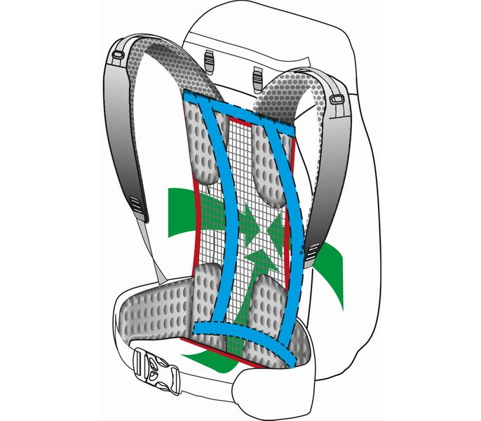 - Спина: завдяки системі Dry Net System Back є повністю вентильованою. Додатковий повітряний простір між спиною і рюкзаком сприяє ефективній вентиляції. Валики з м'якою пінополіуретановою підкладкою обшиті дихаючої сітчастої тканиною;