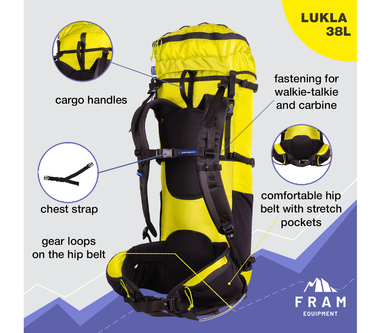 Lukla 38 - рюкзак для вікенду у горах. Має ідеальний розмір та форму для невеликих подорожей і тренувань. Чудово підійде для походу в Карпати на двох - легкий намет, два спальника, кухня, тепла річ. Або зібрати комплект для тренувань - мотузка, система, спорядження, кішки та інструменти. Чи для  трекінгу в бейс кемп Евересту, зі своїм спальним мішком і легким утепленням.