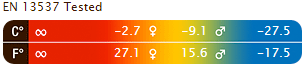 - EN Рейтинг: комфорт: 27,1°F / -2,7°C; нижня межа: 15.6°F / -9,1°C; Екстремальний: -17,5°F / -27,5°C;