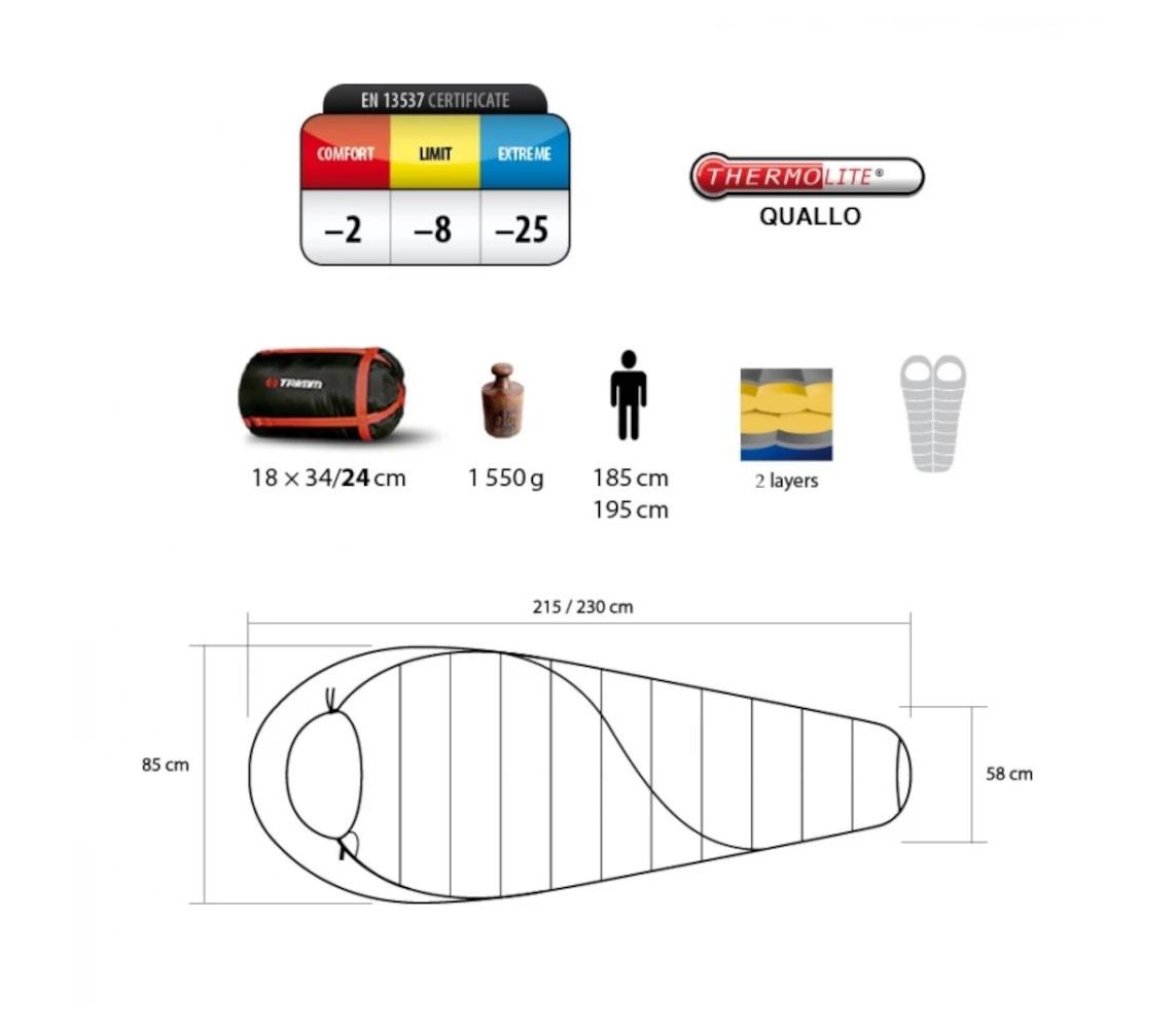 Трисезонний спальник від бренду Trimm. Зовнішній матеріал (нейлон) покритий DWR просоченням, яке захищає від вологи. Ефективну теплоізоляцію забезпечує штучний наповнювач Termolite Quallo, оптимальна температура комфорту: -2°C.
