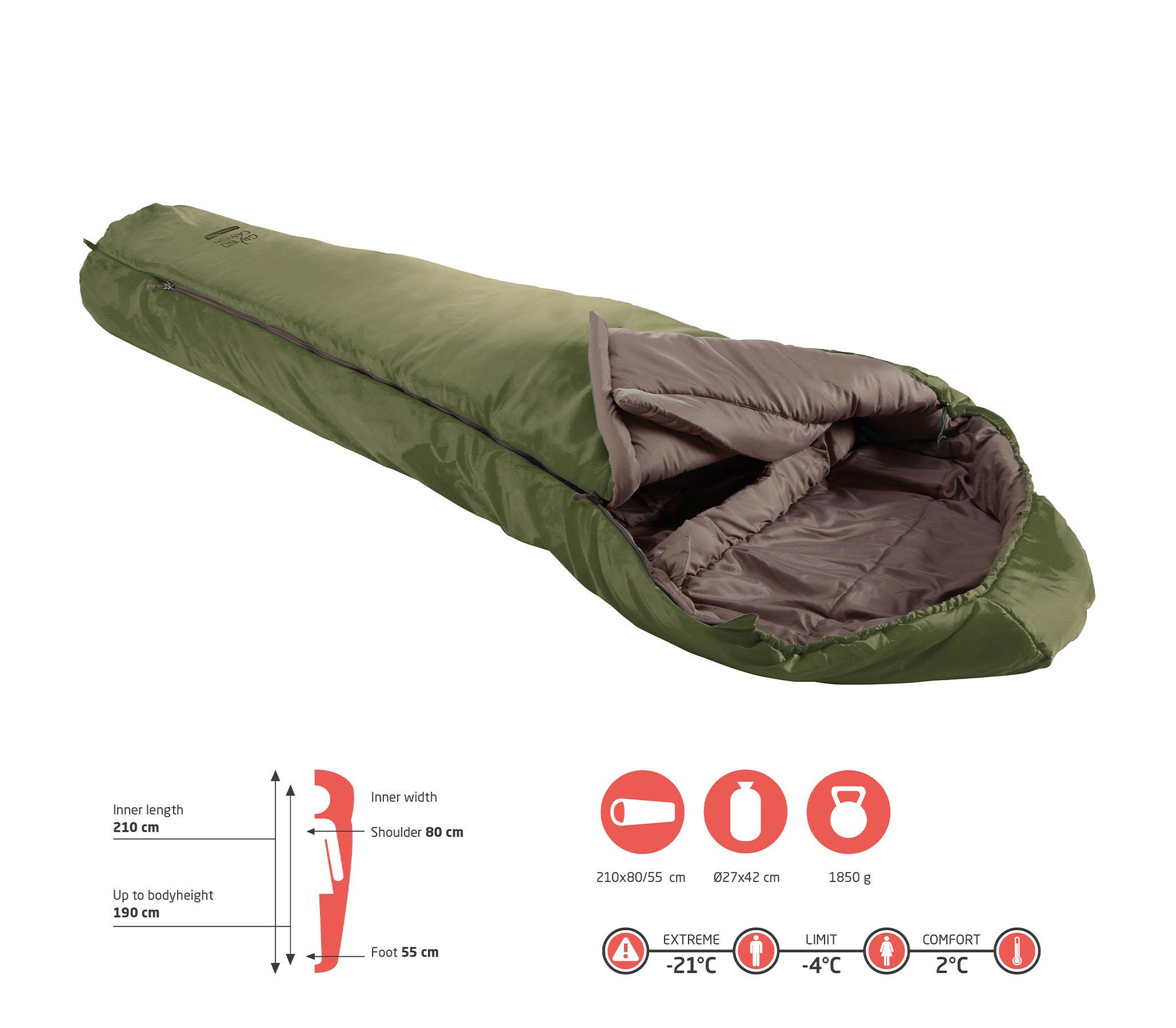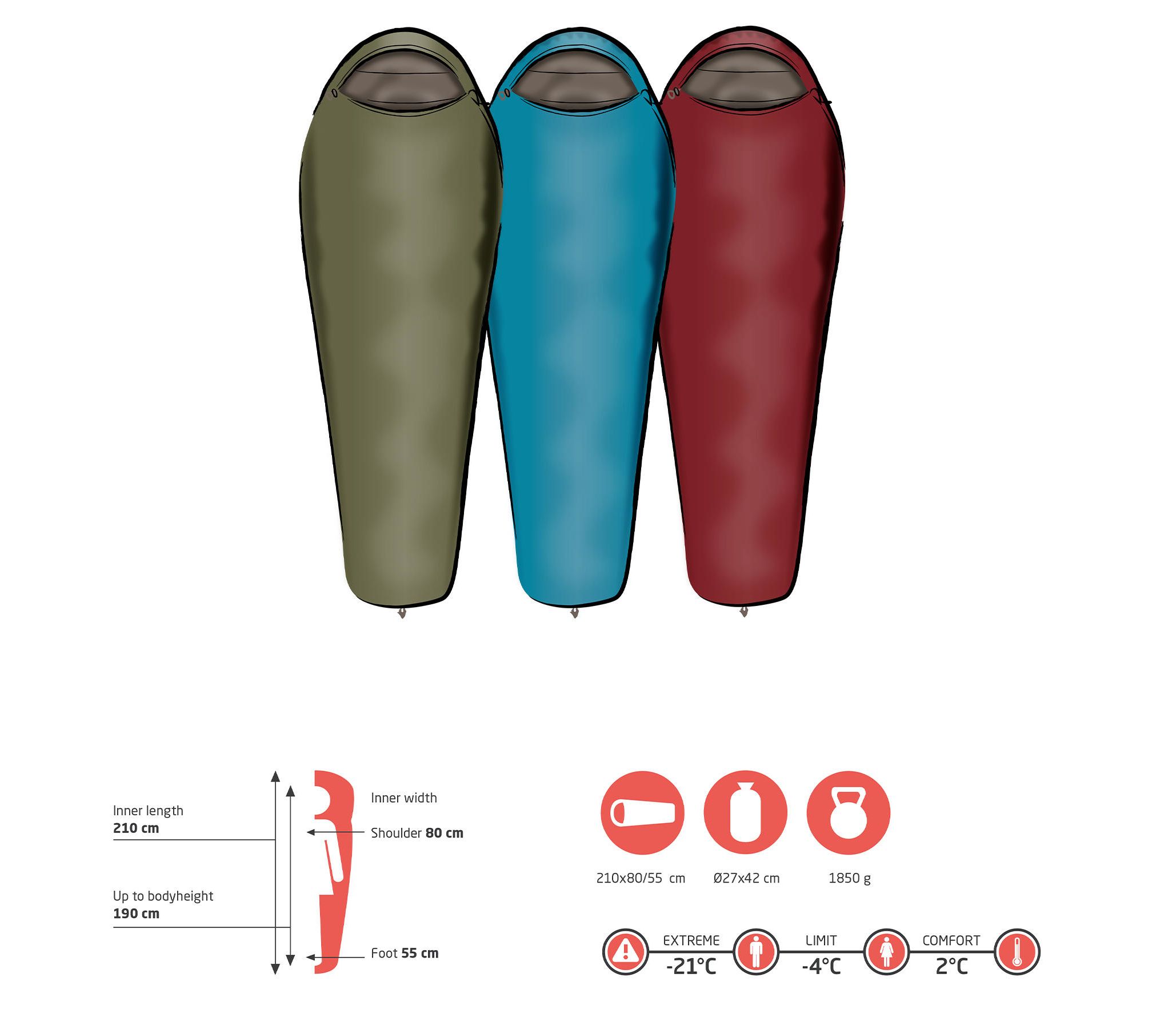 Ряд конструктивних деталей покликані підвищити теплоізоляційні властивості і ізолювати відпочиваючого від холоду, зокрема спеціальний комір із затяжками, що відділяє внутрішній простір від капюшона, утеплюючий борт вздовж блискавки, та форма кокона що повторює контури тіла людини, сприяючи кращому збереженню тепла. Нижня критична температура використання цього спального мішка в екстремальних умовах сягає -21°C. А при перегріві можна розстібнути блискавку знизу або зверху, при цьому зберігаючи тепло в ногах. Зовнішня оболонка спального мішка виконана із матеріалу Polyester Rip-stop - стійкого до порізів та розривів. В якості утеплювача застосований наповнювач з пустотілого мікроволокна Holoow Fiber, що має малу вагу та відмінні термоізоляційні характеристики. Цей утеплювач практично не схильний до "злежування" і забезпечує заявлений температурний режим сну навіть у вологих умовах.