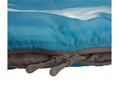 - Блискавка оснащена двома замками, верхній з яких – двосторонній. Таким чином блискавка зручно розстібається і застібається як зовні, так і зсередини, дозволяючи також відкрити нижню частину спального мішка для провітрювання;