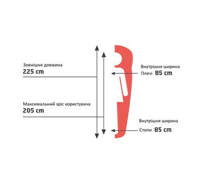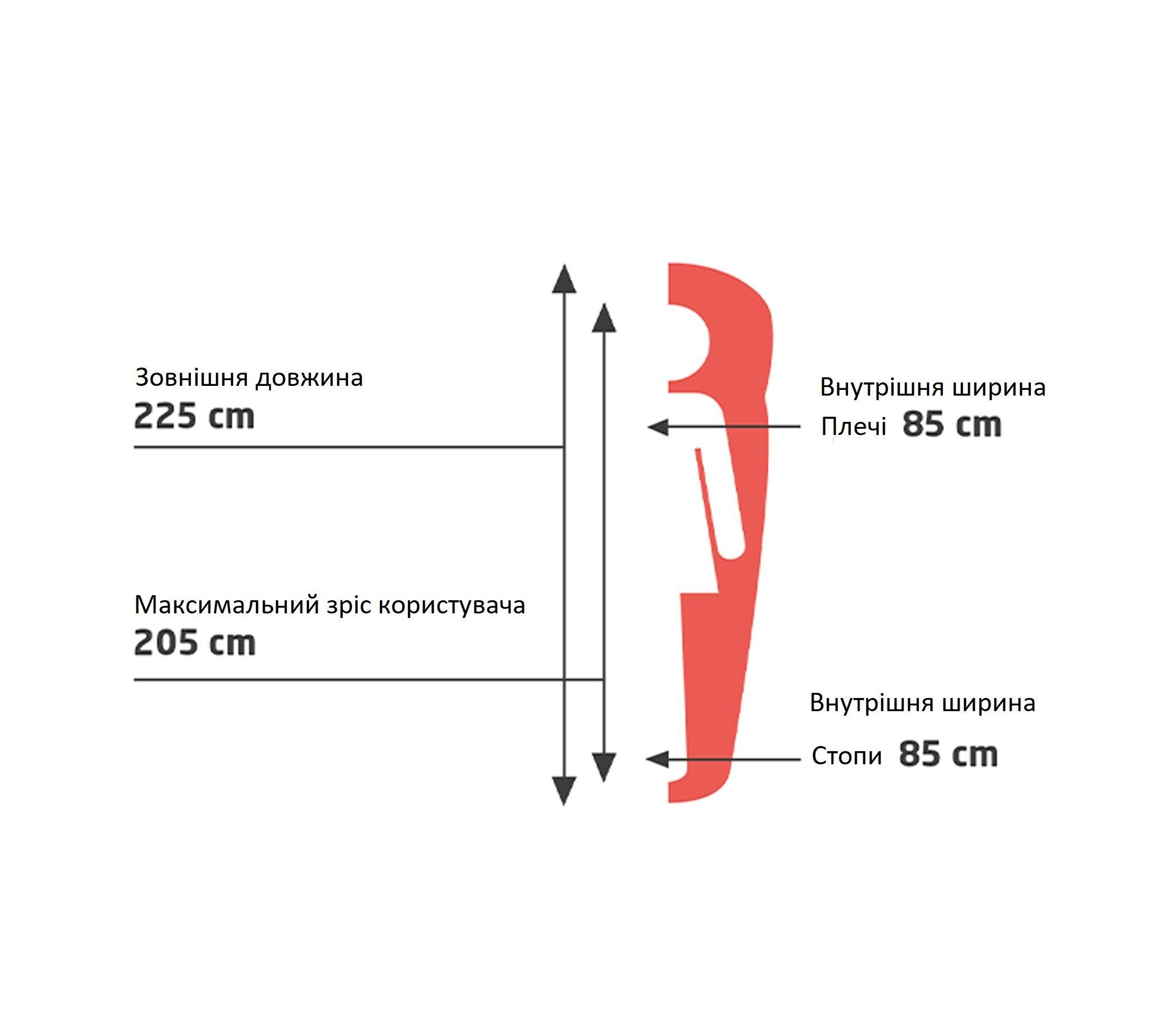 - Розміри (Довжина х Ширина в плечах х Ширина в ногах): 225 x 85 х 85 см