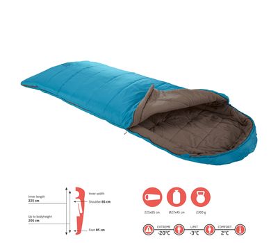 Grand Canyon Utah 205 -3°C Caneel Bay Left це трьохсезонний спальний мішок, в першу чергу призначений для високих користувачів і для туристів, що віддають перевагу більш просторим спальним мішкам, які забезпечують належну свободу рухів під час сну. Його можна використовувати при температурі до -3°C, а екстремальна температура використання -20°C. Більш того, маючи прямокутну форму і блискавку по периметру, дана модель в розстібнутому вигляді дозволить зігрітися 2-3 людям, які використовують його в якості широкої ковдри.