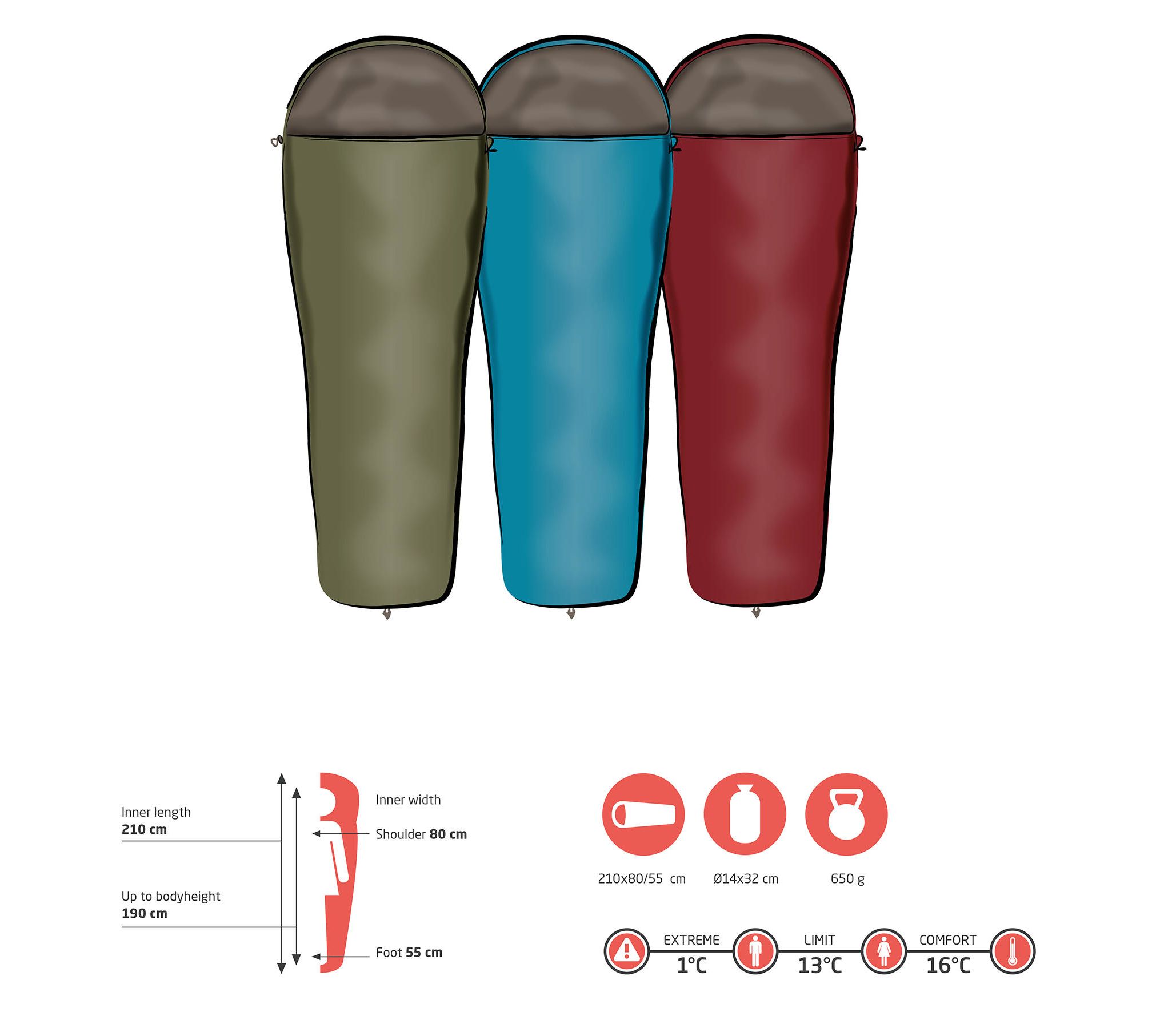 - Наповнювач: Micro Polyester Hollow Fibre (синтетичний утеплювач, який характеризується відмінним співвідношенням теплоізоляційних властивостей до власної ваги, а також має мінімальну залишкову деформацію. Порожні мікроволокна вбирають і відводять вологу на зовнішній матеріал спального мішка.)
