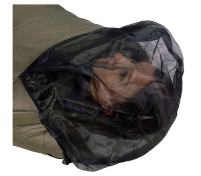 - Москітна сітка міститься в спеціальній фасадній кишені, має еластичну стяжку з силіконовою смужкою по всьому периметру, завдяки чому надійно фіксується за капюшоном спальника та перешкоджає проникненню комах всередину, забезпечуючи необхідний доступ повітрю.