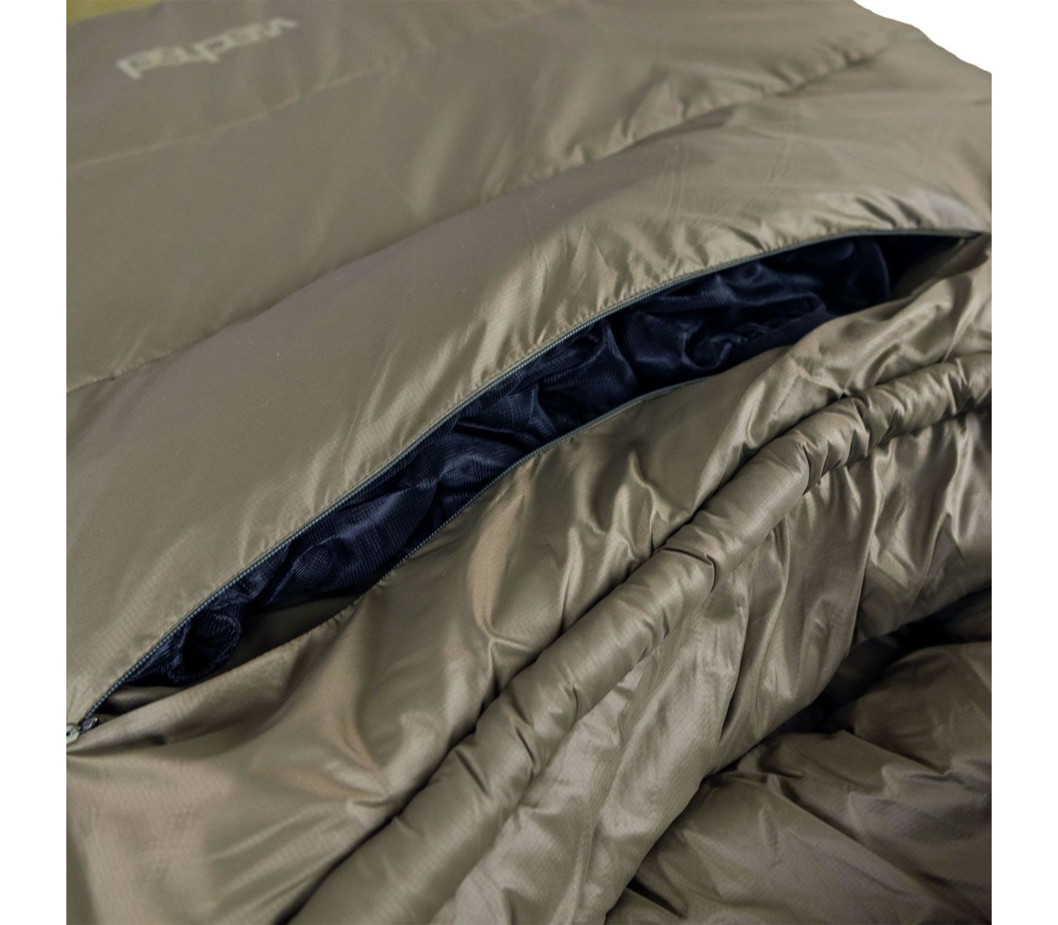 - Дно спального мішка має не лише додатковий шар утеплювача, але й утеплюючий борт вздовж нижньої блискавки та еластичну стяжку для збереження тепла в області ніг.