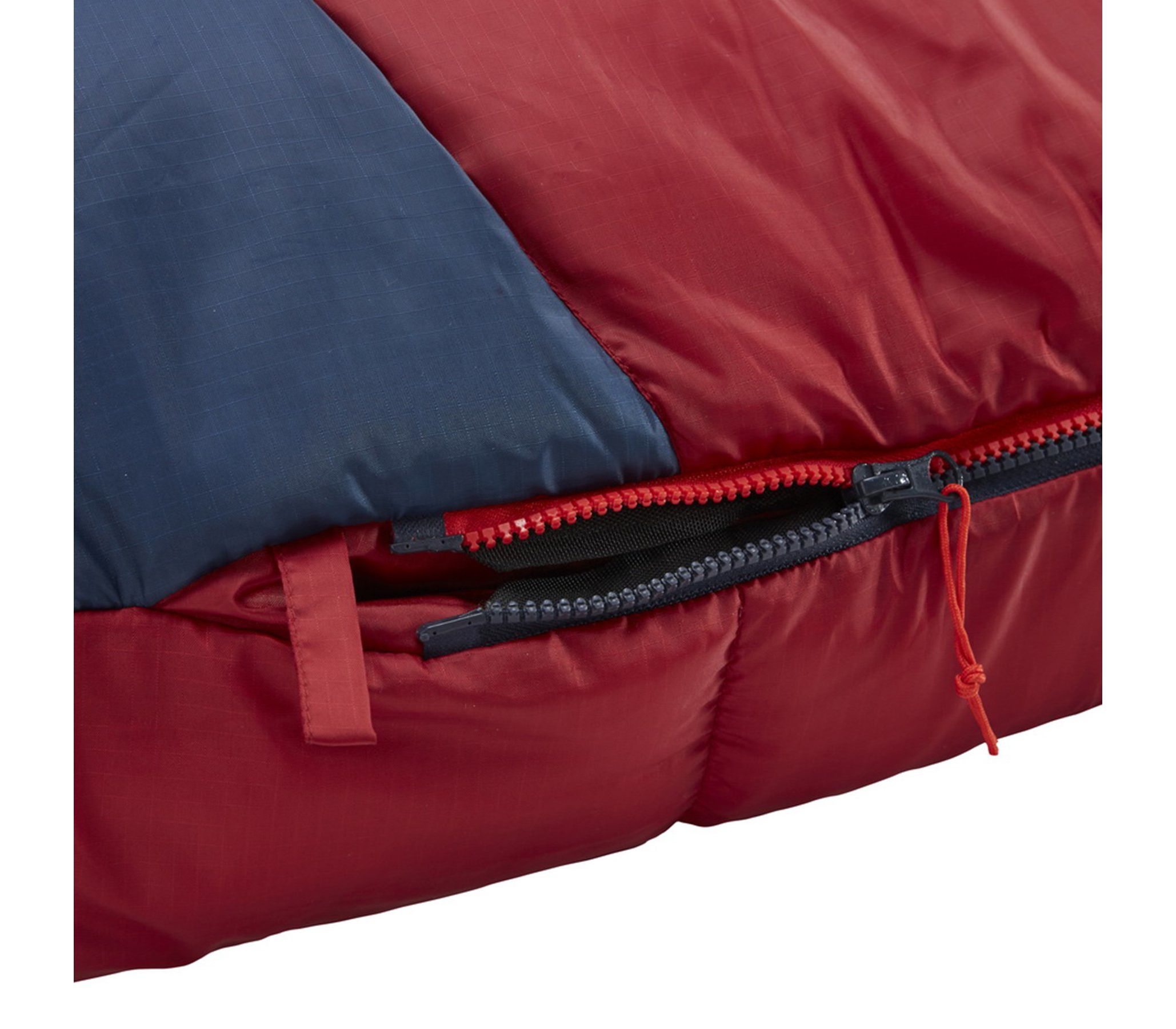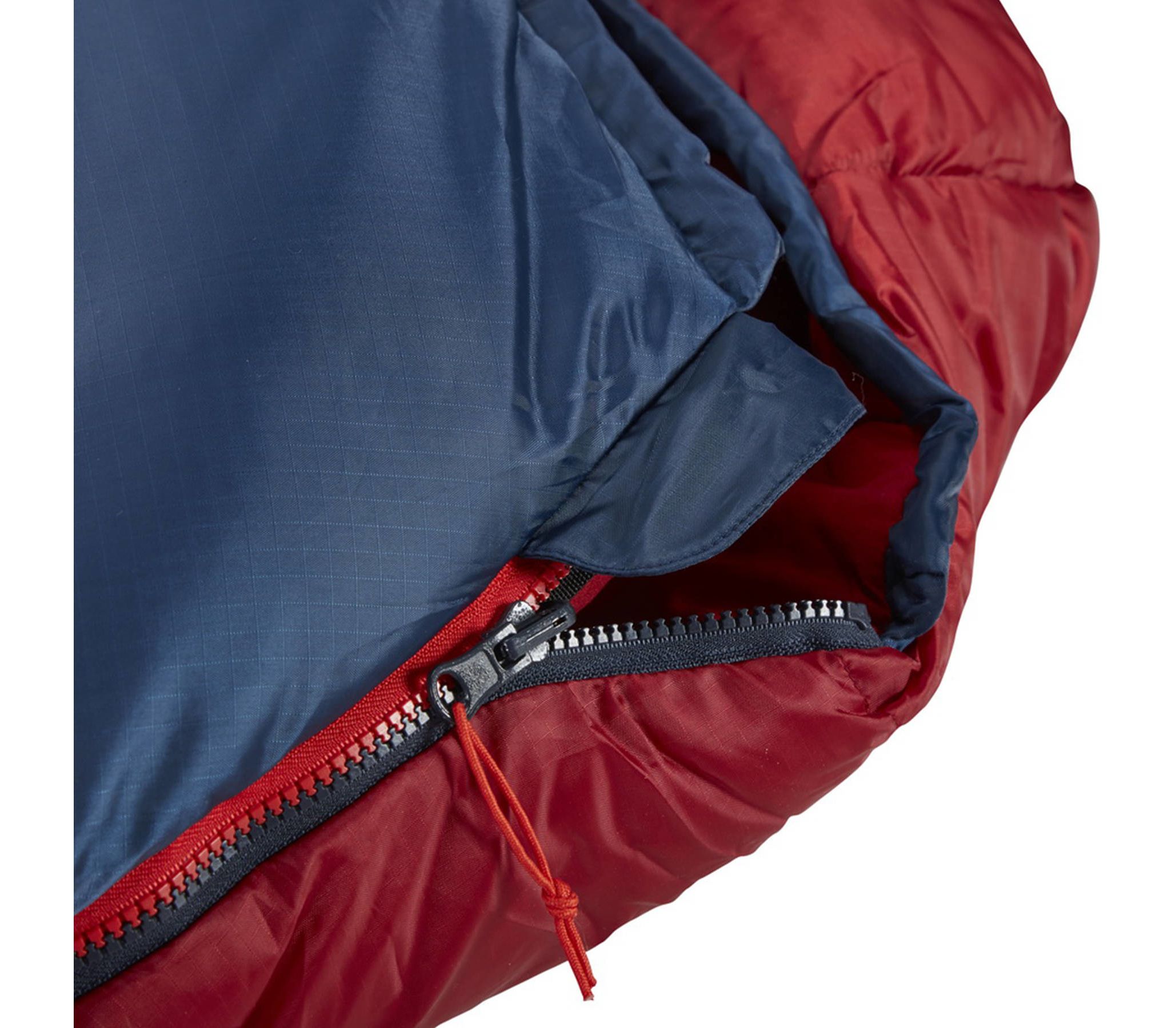 - Блискавка оснащена двома замками, верхній з яких – двосторонній. Таким чином блискавка зручно розстібається і застібається як зовні, так і зсередини, дозволяючи також відкрити нижню частину спального мішка для провітрювання.