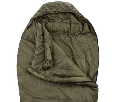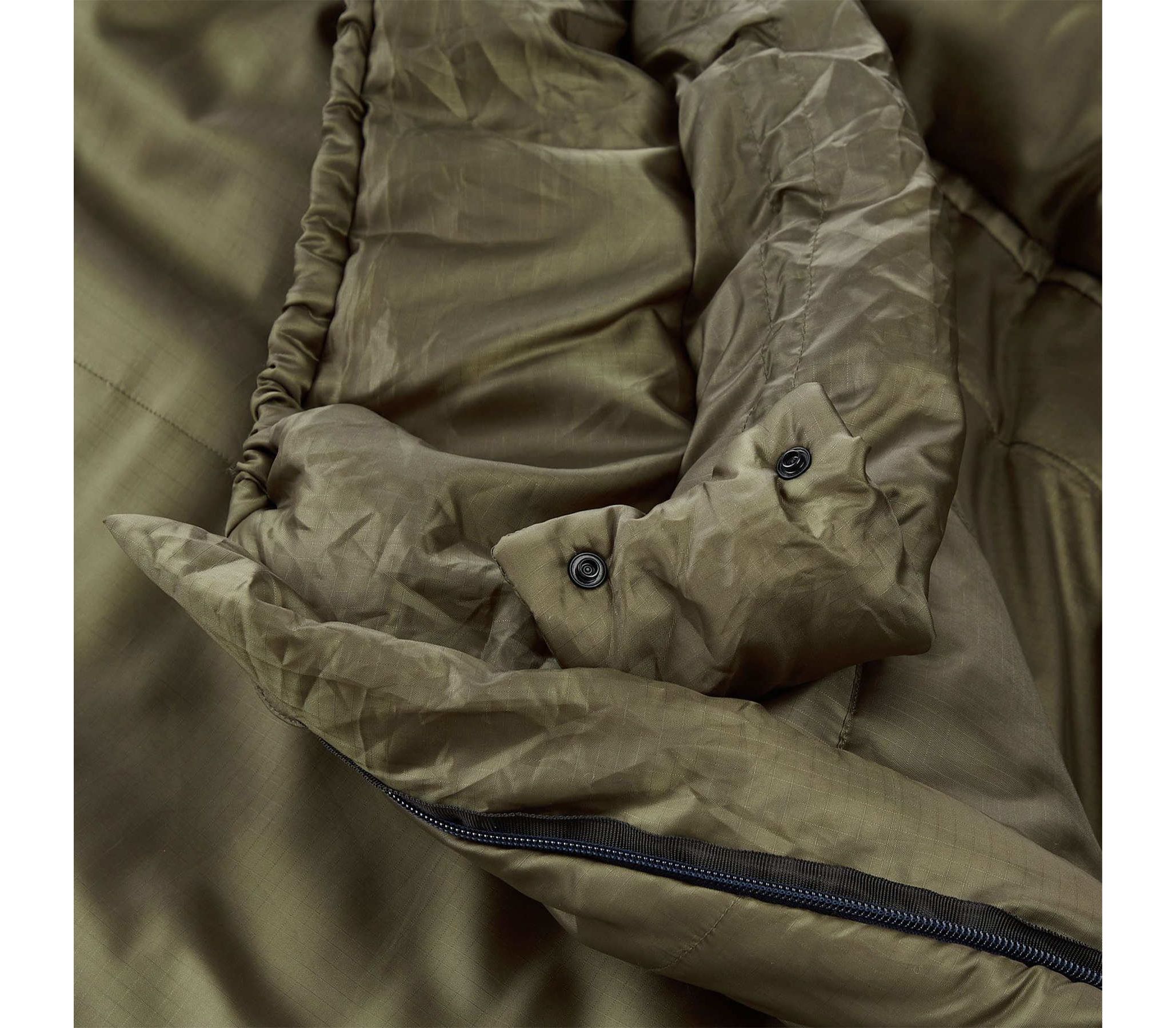 - В області шиї передбачений об'ємний комір, який закривається пластиковими кнопками, регулюється стяжкою і створює додатковий термоізоляційний бар'єр, що перешкоджає проникненню холодного повітря всередину спального мішка.