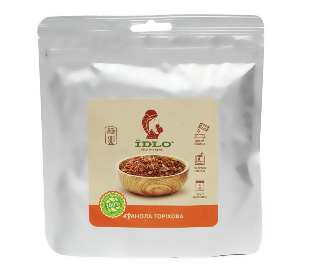 Гранола горіхова ЇDLO 100гр - продукт виготовлений методом інфрачервоної сушки з 100% натуральних продуктів без використання консервантів, добавок і ГМО. Можна їсти прямо з пачки, яка має широке дно і зручну герметичну застібку зверху. Просто залийте ЇDLO 200-250 мл молока, соку або йогурту, перемішайте і їжте із задоволенням.