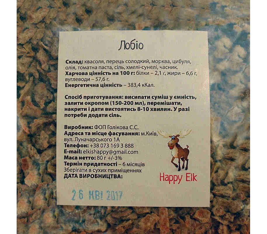 Лобио Happy Elk 80гр - вегетаріанське блюдо, вибір для походів і подорожей. Сушка дозволяє зберегти первинний смак страви, більшість поживних речовин, вітамінів і мікроелементів при невеликій вазі в порівнянні з тим же кількістю свіжих продуктів.