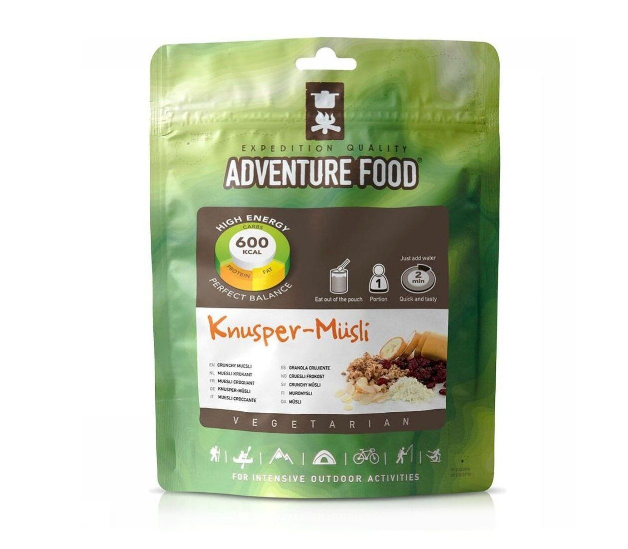 Сублімована їжа Adventure Food Knusper-Müsli мюслі зі снеками-повноцінний сніданок на основі хрустких мюслі, молока, мигдалю, журавлинних кубиків і бананових чіпсів. Калорійність порції: 600 ккал (2512 кДж)