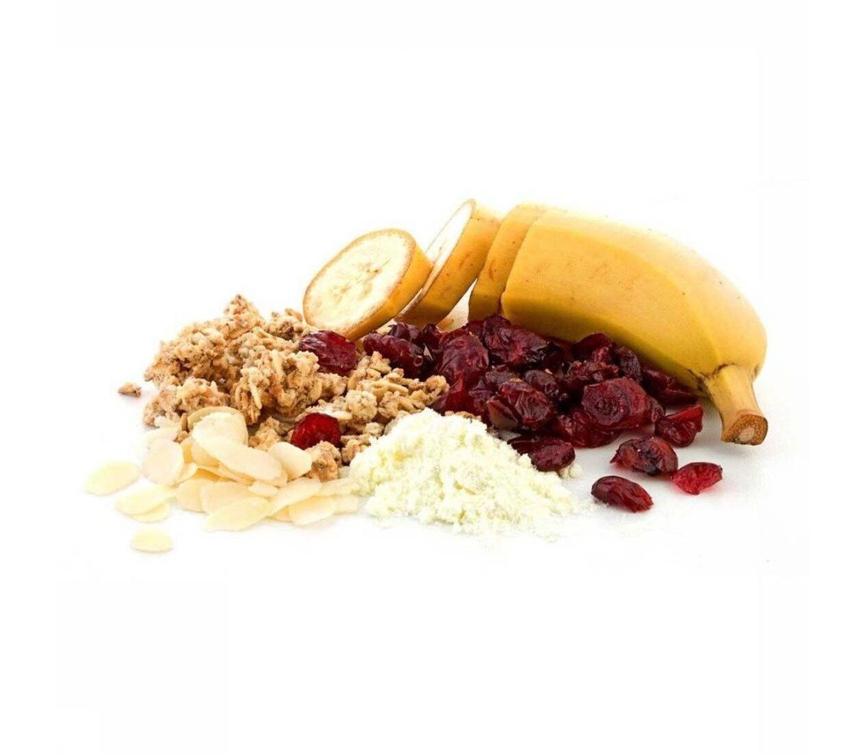 Склад: 64% мюслі (овес, пшениця, цукор, соняшникова олія, родзинки, сироп глюкози, кокос (2%), насіння соняшнику, мигдаль (1.00%), барвник (карамель), мед, кухонна сіль, натуральна ваніль, антиоксидант (E306)), сухе молоко, 12% журавлина, підсолоджена (журавлина, цукор, соняшникова олія), 8% бананові чіпси (банан, кокосова олія, цукор, банановий ароматизатор), соняшникова масло, сироп глюкози.