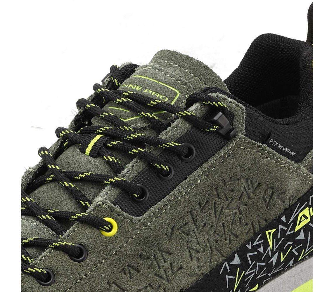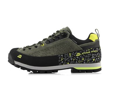 Alpine Pro Wasde - чоловічі трекінгові кросівки. Верх зроблений з міксу шкіри та текстилю, носок і боки взуття добре прогумовані для захисту від гілок і каміння. Шнурівка досить глибока, щоб припасувати кросівки під різну стопу.