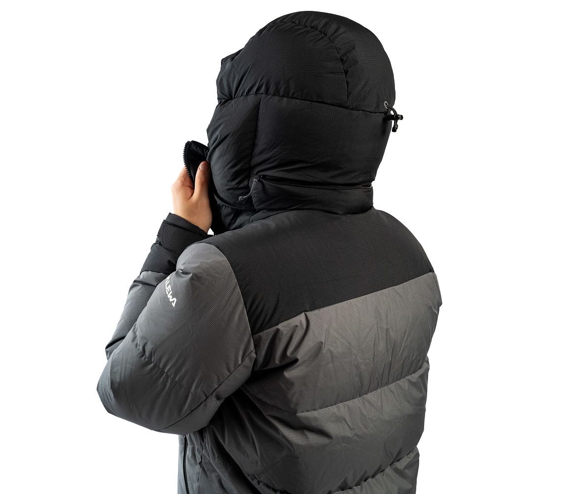 Для максимального захисту від вітру, опадів і холоду є два капюшони – м`який внутрішній та зовнішній на блискавці. Капюшон регулюється, з високим воротом, широкі манжети на липучках. Передня блискавка водонепроникна, з планкою, яка захищає від вітру. Під час активного руху поділ куртки, який регулюється, не зісковзує. Є дві кишені для рук на блискавці, дві внутрішні кишені і нагрудна кишеня, також на блискавці. У комплекті є компактна сумка для зберігання куртки.